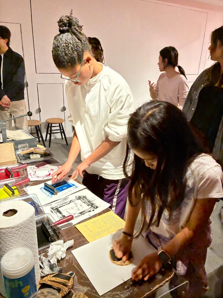 As we entered November, we partnered for the first time with the Storefront for Art and Architecture in conjunction with their exhibition Território vivo by Sertão Negro. Inspired by the exhibition’s premise of quilombos as spaces of freedom, culture, and care, Octavia Project participants, parents, and community members made lino prints reflecting on housing rights and home. These prints used symbols like windows, gardens, fireplaces, and pets to represent our universal right to safe, warm, welcoming homes.